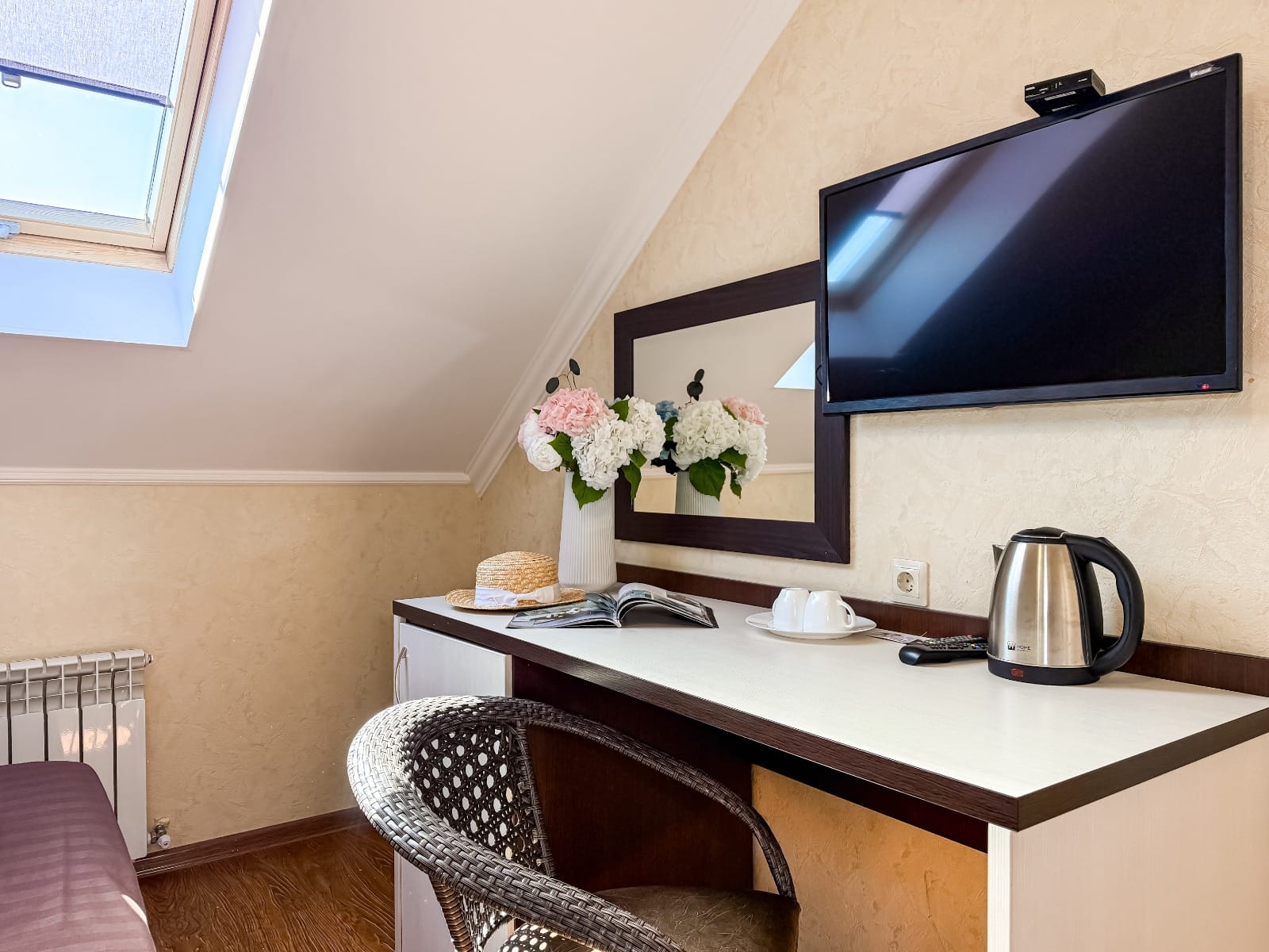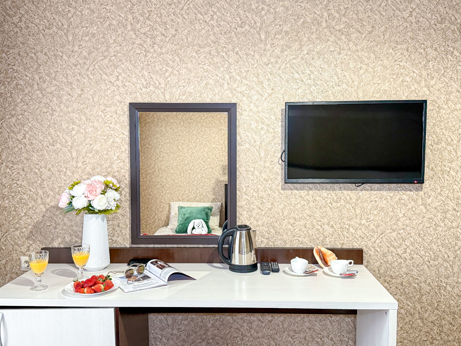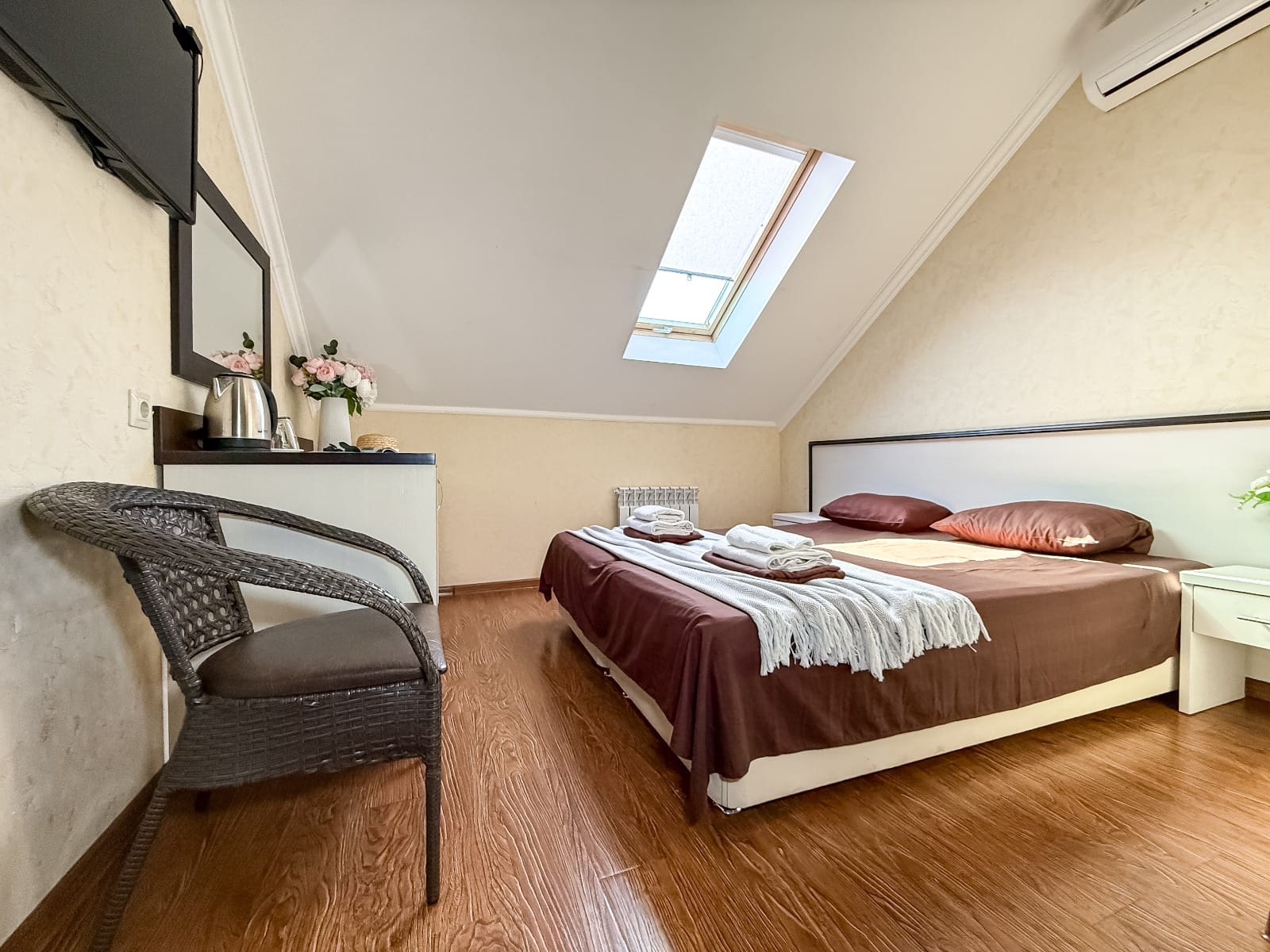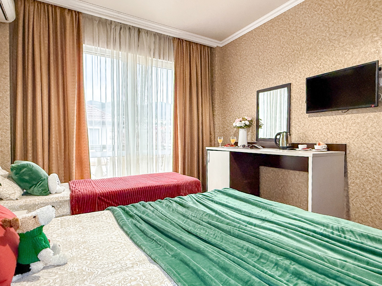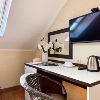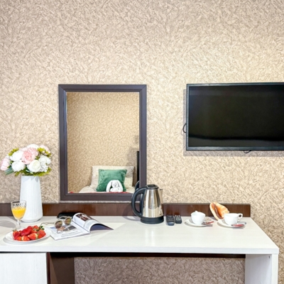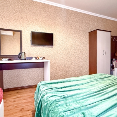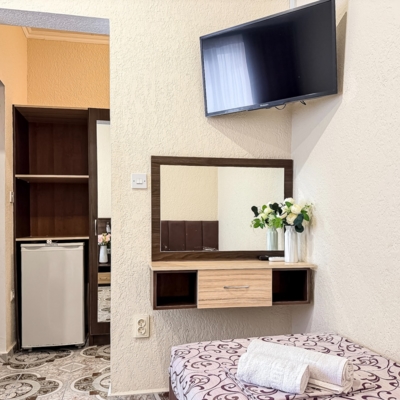 - Современные оборудованные номера: кондиционер, холодильник, телевизор, душ, c/у, электрический чайник;